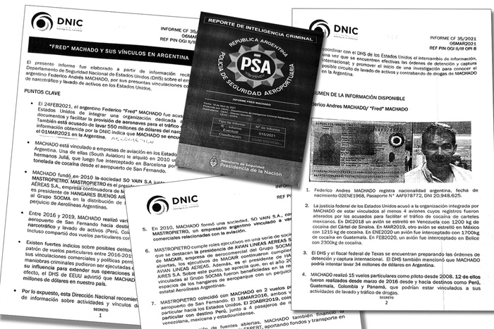 A la Policía de Seguridad Aeroportuaria (PSA) le tocó detener a Machado en 2021, por pedido de la justicia de Texas. Todo hace pensar, que la conducción del Ministerio de Seguridad le ordenó entonces a Inteligencia Aeroportuaria que junte información sobre Machado, gran parte en base a lo que venía de Estados Unidos. En el texto dice que el informe se hace por el pedido del Ministerio de Seguridad, para agregarlo al otro informe, el de la Dirección de Inteligencia Criminal, que ya estaba hecho.