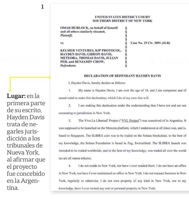 En una declaración espontánea que presentó el lunes pasado ante el juzgado federal de Nueva York en el que tramita la demanda colectiva –class action– en su contra, el empresario estadounidense Hayden Mark Davis adjudicó el colapso de la criptomoneda $LIBRA a la decisión del presidente Javier Milei de borrar el tuit en el que le había dado visibilidad. Insistió en que no se trató de una estafa, sino de un proyecto que buscaba financiar a pequeñas empresas y proyectos educativos.