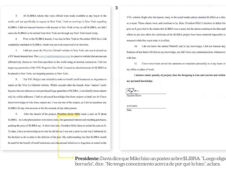 Con la declaración de Davis se produjo un avance en el expediente abierto en la justicia norteamericana a partir de la presentación que hicieron en ese estamento inversores de Estados Unidos damnificados por el auge y el súbito desplome de la criptomeneda. Es una causa en la que se intenta determinar si se configuró algún delito en la operación de $LIBRA y en la que no están imputados ni el presidente Milei ni su hermana, la secretaria general de la Presidencia.