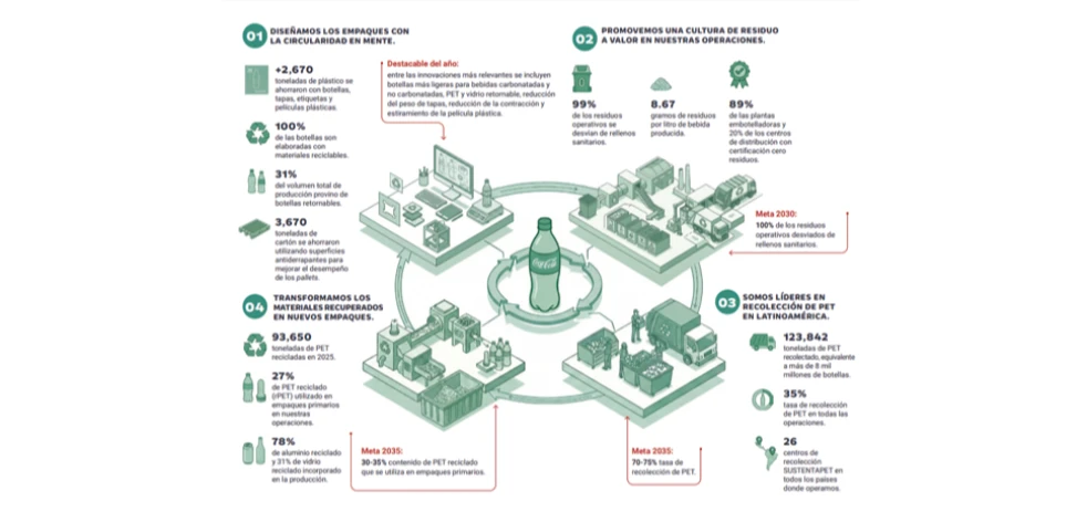 Para Coca-Cola FEMSA, la circularidad del empaque empieza en el diseño: cada botella se formula para contener la menor cantidad de resina posible y para que todos sus materiales sean 100% reciclables. En 2025, la compañía recolectó 123,842 toneladas de PET. Fuente: Informe Integrado 2025 de Coca-Cola FEMSA