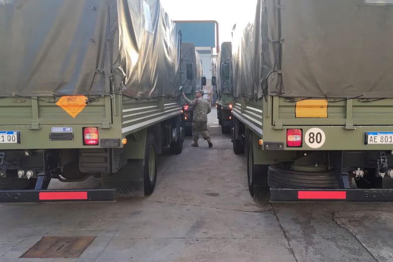 Los camiones del Ejercito Argentino en los galpones de Villa MartelliMinisterio de Defensa