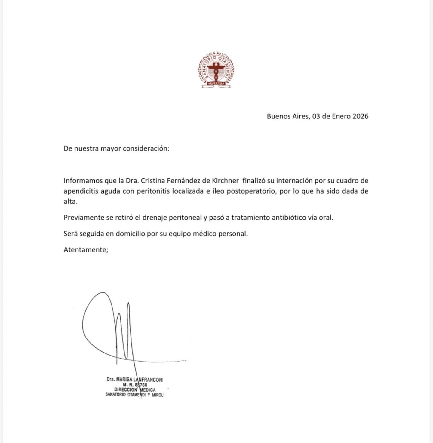 La expresidenta Cristina Fernández de Kirchner fue dada de alta del sanatorio Otamendi, donde permaneció internada por un cuadro de apendicitis aguda con peritonitis localizada e íleo postoperatorio.
