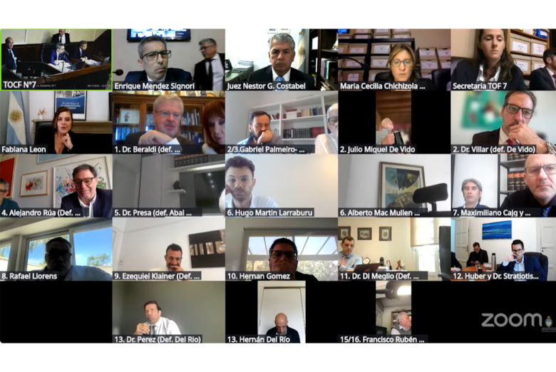 Méndez Signori, Fernando Canero y Germán Castelli estuvieron físicamente en una sala de audiencias en el sexto piso del Palacio de Tribunales, en Talcahuano 550. Los 87 acusados, en cambio, siguieron el juicio desde sus casas o desde los estudios de sus abogados, conectados por Zoom.