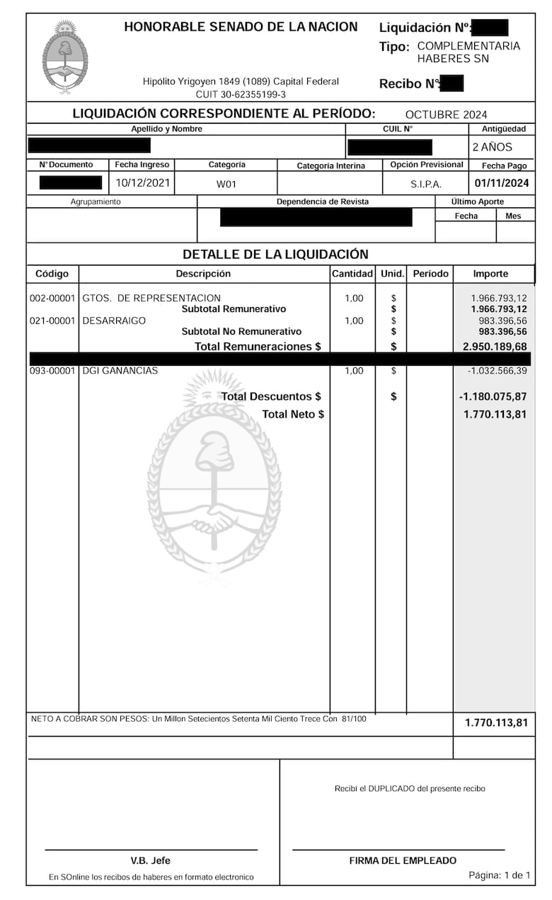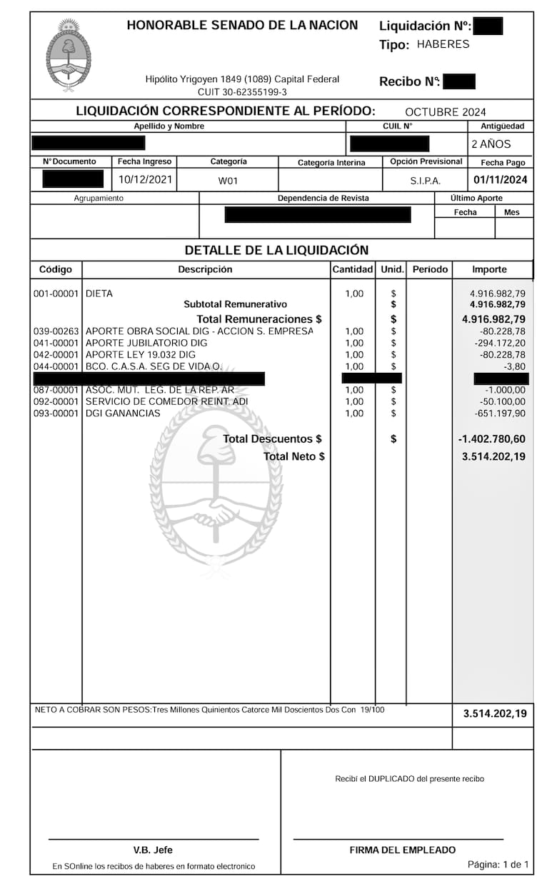 Los senadores no ganan ni ganarán más de 9 millones de pesos. Es una aseveración del Gobierno que está más relacionada con la distancia, al parecer sin remedio, entre el Presidente y la vicepresidenta que con la verdad. ¿Cuánto gana un diputado? Silencio. Eso no se cuestiona. Martín Menem es el escudo que los protege. Villarruel juega otro partido, más brutal y constante. Según el recibo de sueldo de un senador del interior del país, este cobró como dieta el primer día de noviembre pasado 3.514.202,19 pesos, a lo que deben sumársele 1.770.113,81 pesos por desarraigo y gastos de representación. En total, son 5.284.316 pesos. Ese es el monto que reciben en mano. Pero aun el salario bruto, sin descuentos, es de poco más de 8 millones de pesos.