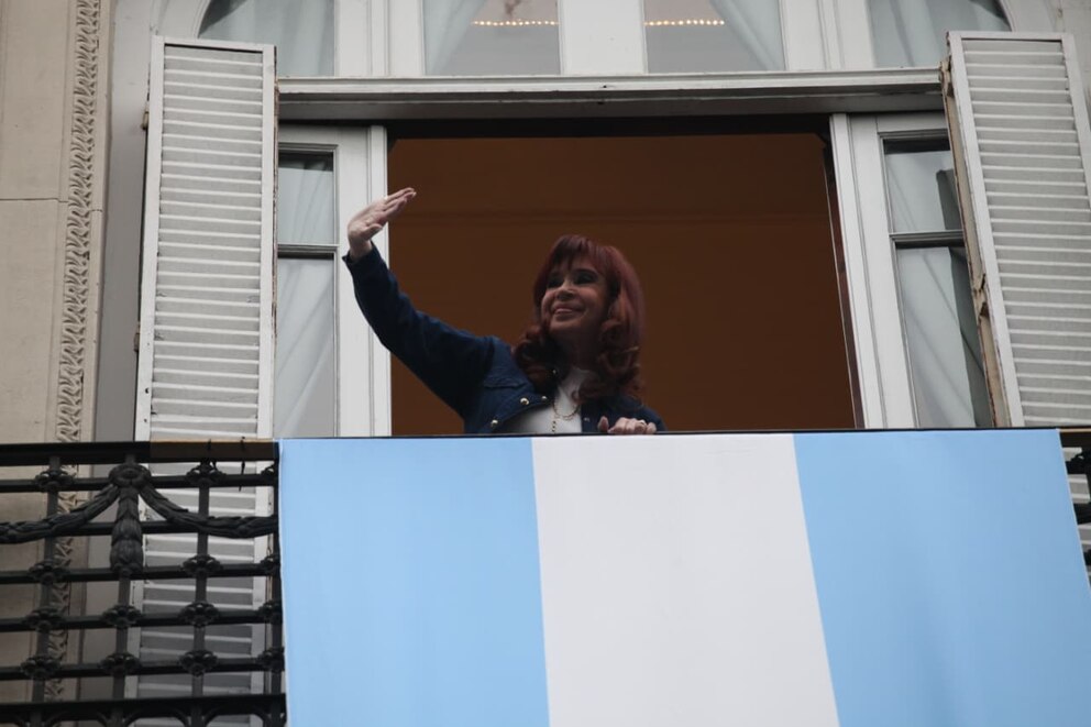 Cristina Kirchner saluda durante la movilización a San José 1111 para celebrar un nuevo Día de la Lealtad peronista