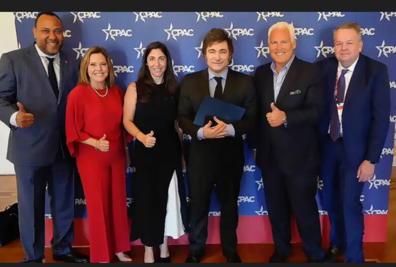 Milei, en una reunión de CPAC, junto con Matt y Mercedes Schlapp, Soledad Cerro y Barry Bennet