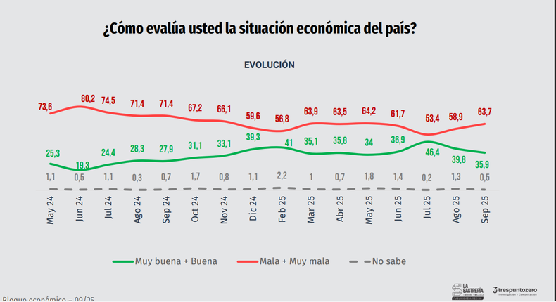 Trespuntozero y La Sastrería encontraron otros factores de alerta. La evaluación negativa de la gestión del Gobierno subió a 57,9%, tres puntos por encima del mes pasado. La opinión sobre la situación económica también empeoró. Creció de 58,9% a 63,7% en el último mes. ¿Cambiaría el escenario el acuerdo con Estados Unidos o el monumental anuncio sobre la inversión billonaria de Open IA?