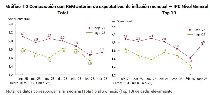 A la par de la crisis recesiva, el gobierno de Milei tampoco podrá jactarse de bajar la inflación durante el último trimestre del año, según las previsiones del REM. El informe adelantó que el índice de precios al consumidor se habría acelerado al 2,1 por ciento en septiembre (0,3 puntos más en comparación al REM anterior). Para peor, los precios aumentarían 2 por ciento en octubre, 2,1 por ciento en noviembre y 2 por ciento en diciembre. Es decir, el año finalizará sin romper el piso del 2 por ciento, interrumpiendo cualquier idea de desaceleración sostenida. Así, la variación acumulada de 2025 treparía al 29,9 por ciento para la inflación general y 31,6 por ciento para la núcleo.