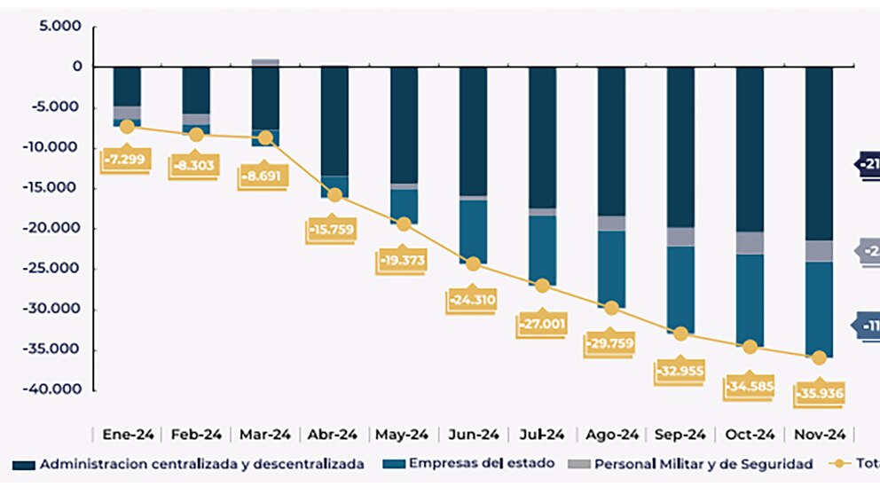 La reducción de la planta de empleados del Estado durante los primeros 12 meses de mandato del presidente Javier Milei, precisó, fue en total de 35.916 personas entre diciembre de 2023 y noviembre de 2024, lo que equivale a una reducción del 7,2% del personal.