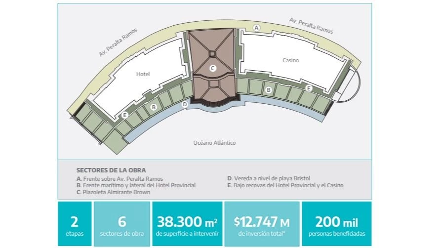 Esta instancia incluye la puesta en valor de cuatro sectores de los cinco en los que se dividió la Rambla. El A abarca el frente sobre Avenida Peralta Ramos, el B el frente marítimo y lateral del Hotel Provincial, el C la Plazoleta Almirante Brown y el D la vereda a nivel de playa Bristol. Para el próximo año quedará el sector E, constituido por el bajo recovas del Hotel Provincial y el Casino.