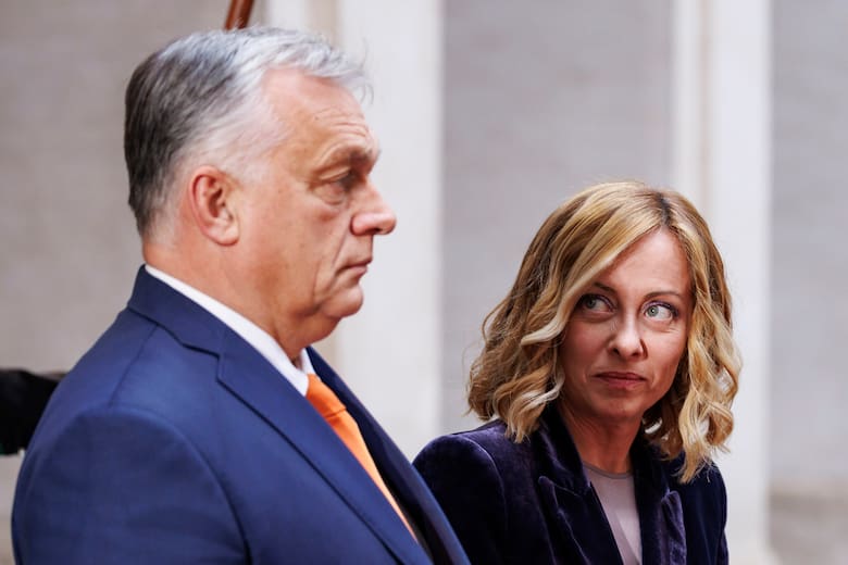La primera ministra italiana, Giorgia Meloni, a la derecha, recibe al primer ministro húngaro, Viktor Orbán, durante una reunión en Roma, Italia, el miércoles 4 de diciembre de 2024. (Foto de Roberto Monaldo/LaPresse vía AP)Roberto Monaldo - LaPresse