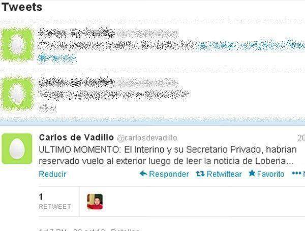 Ayer por la tarde, luego de conocerse la noticia sobre el asesinato del intendente de Lobería, Hugo Rodríguez, De Vadillo “twiteó”: ““ULTIMO MOMENTO: El Interino y su Secretario Privado habrían reservado un vuelo al exterior luego de leer la noticia de Lobería”.