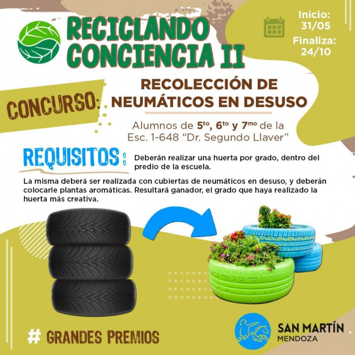 La Municipalidad de Gral. San Martín a través de Programas Nacionales cuyo director es Alfredo Sozzi y la coordinación de Renata Guidoni dentro del mes del reciclaje, convoca a la segunda edición del concurso "Reciclando Conciencia" a través de una cruzada solidaria para la Escuela 1-468 "Doctor Segundo Llaver" en Bº Vennier de Palmira. Esta convocatoria del Intendente junto a algunos empresarios de San Martín comprometidos con la necesidad de la protección del medio ambiente, como por ejemplo el Sr. Rodrigo Parra, es para que toda la comunidad tome conciencia modificando algunos hábitos y conductas habituales y desarrollar una sociedad más respetuosa y cuidadosa en cuanto al individuo y su medio que lo circunda y determina como tal.