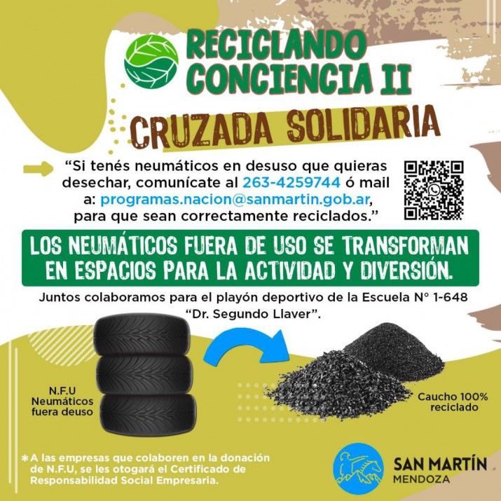 Esta cruzada solidaria se centra en la sensibilización y la educación sobre el reciclaje de neumáticos fuera de uso y promover la reutilización de los mismos para la colocación del piso del playón deportivo en esta ocasión para la escuela mencionada, así es que es un llamado a cada vecino/a, empresas, barrios, bicicleterías, gomerías que no sólo cuenten con neumáticos en desuso sino también colaboren difundiendo este acopio de los mismos, el boca en boca tiene un rol muy importante ya que es el mensaje más directo para tomar conciencia, para avisarle al vecino que done esos neumáticos en desuso, que incluso atrae más basura, contaminación ambiental, dengue, eliminación de roedores, etc. La sociedad en general puede recordar dónde vio, quién tiene, dónde los tiran a esos neumáticos o gomas de bicicletas, y así la cruzada solidaria va siendo una realidad, pero más allá de esta primera instancia de acopio de los mismos para su reciclaje, que se pueda transformar para siempre, en este caso será para una escuela, después otra, y así un mundo circular permanente.
