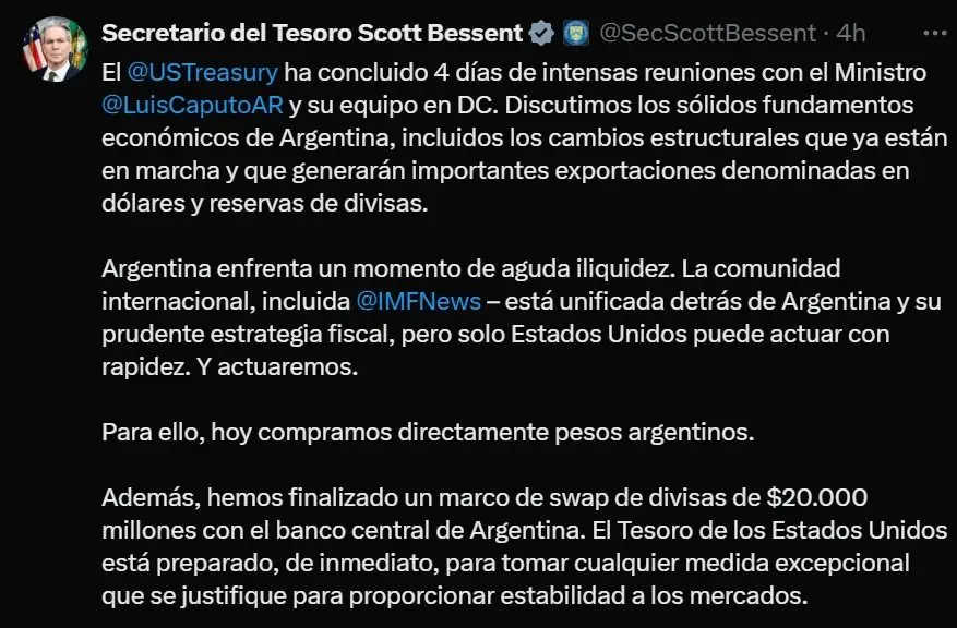 El secretario del Tesoro de EE.UU, Scott Bessent, anunció, a través de un posteo en su cuenta de la red X, el paquete de medidas de auxilio financiero y cambiario para evitar la debacle de Milei.